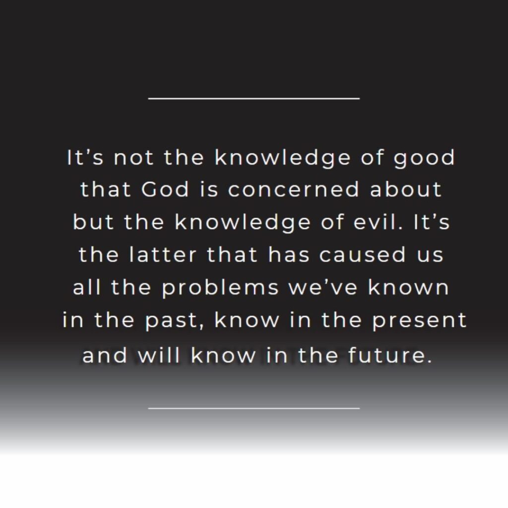 It’s Not The Knowledge Of Good That God Is Concerned About But The Knowledge Of Evil. It’s The Latter That Has Caused Us All The Problems We’ve Known In The Past, Know In The Present And Will Know In The Future.