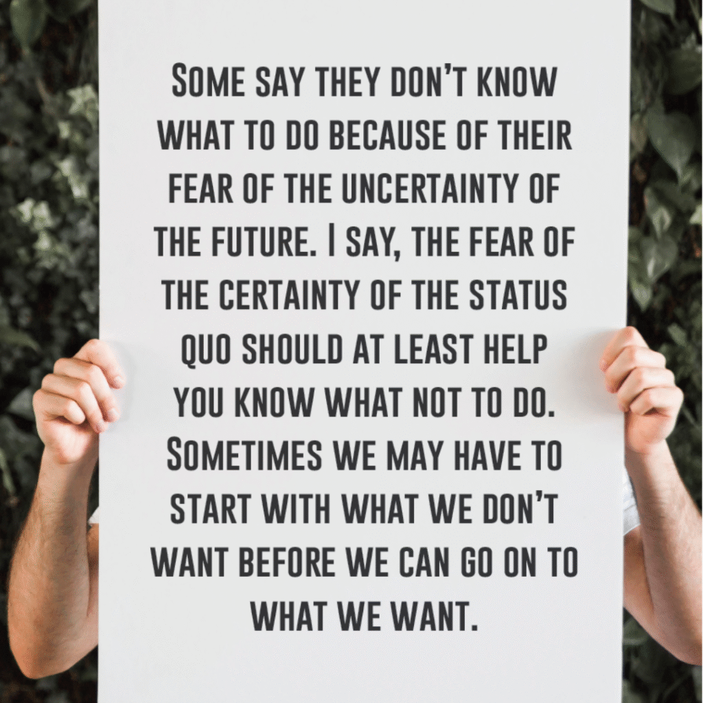 Some say they don’t know what to do because of their fear of uncertainty of the future. I say, the fear of the certainty of the status quo should at least help you know what not to do. Sometimes we may have to start with what we don’t want before we can go on to what we want.
