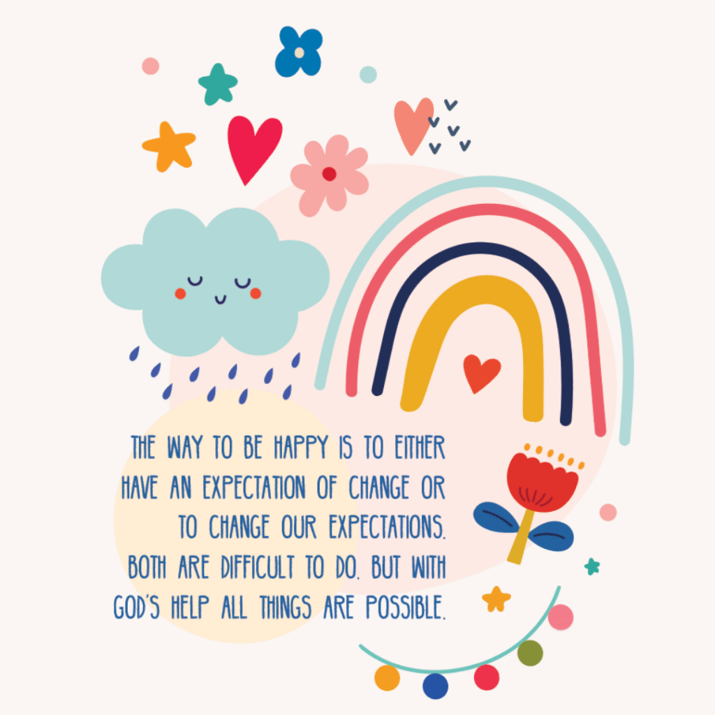 The way to be happy is to either have an expectation of change or to change our expectations. Both are difficult to do. But with God’s help all things are possible.
