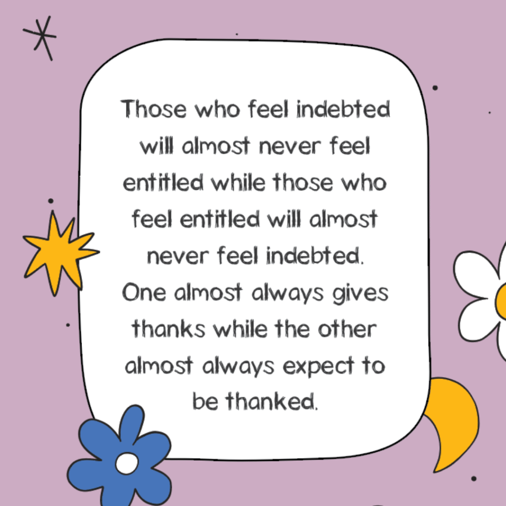 Those who feel indebted will almost never feel entitled while those who feel entitled will almost never feel indebted. One almost always give thanks while the other almost always expect to be thanked.